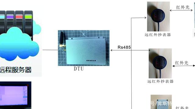 4、DTU与指定的远程服务器连接,用户终端通过访问远程服务器将抄表数据转发到DTU,DTU收到数据后通过RS485总线将数据转成红外信号再发到相应的电表,电表识别了相关报文后返回的数据通过远红外抄表器将红外信号转换成RS485数据返回DTU,DTU再将相关数据回传到远程服务器,远程服务器再将数据传回客户端,从而实现远程实时数据抄表功能。